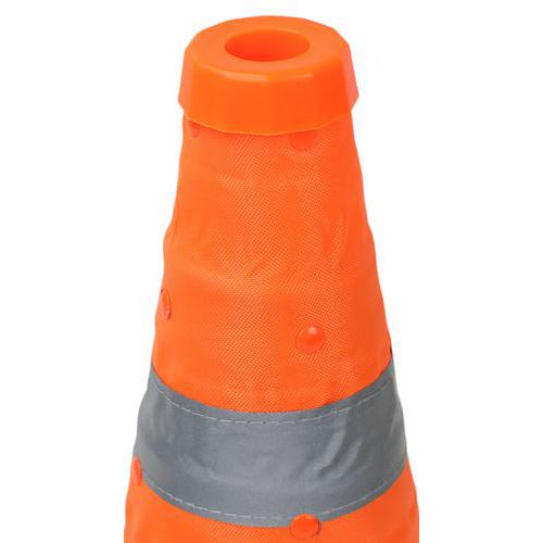 Cone de sinalização retrátil em nylon com faixas refletoras. Cabe facilmente na mala de um automóvel. Tom laranja-vivo com faixas refletoras para garantir a visibilidade à distância.