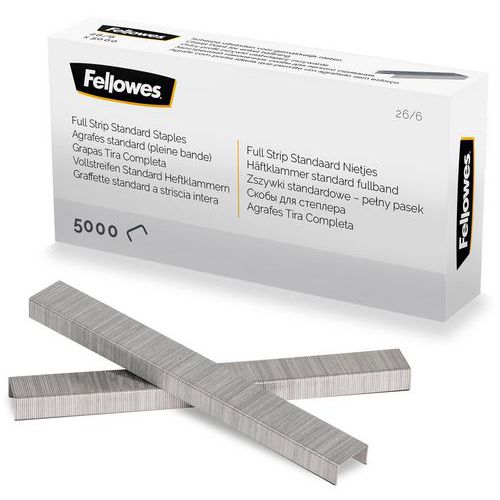 | Nome do artigo | Conjunto de 5000 agrafos 26/6 de faixa integral – 107 mm – Fellowes, Comp.: 111 mm, CE: sim, Largura: 55 mm |