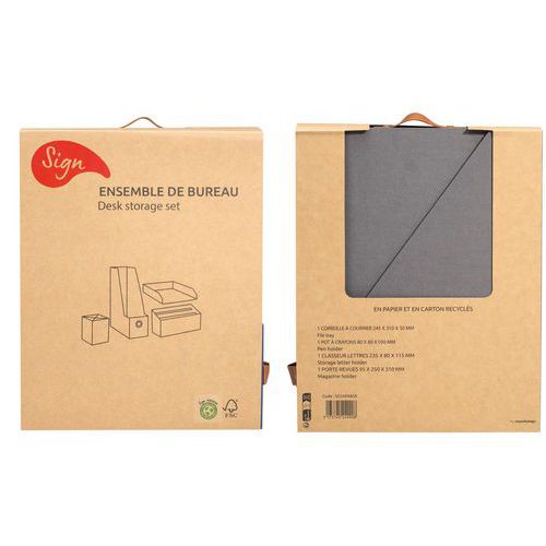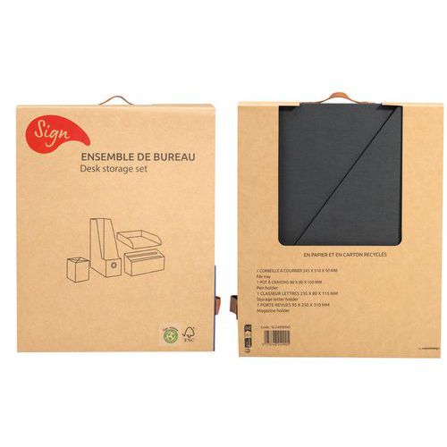 Conjunto de escritório SIGN Reborn. Em papel e cartão reciclados + poliuretano. 4 peças: armazenamento de documentos, recipiente para lápis, cesto de correio A4 e classificador para cartas.
