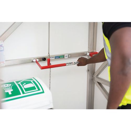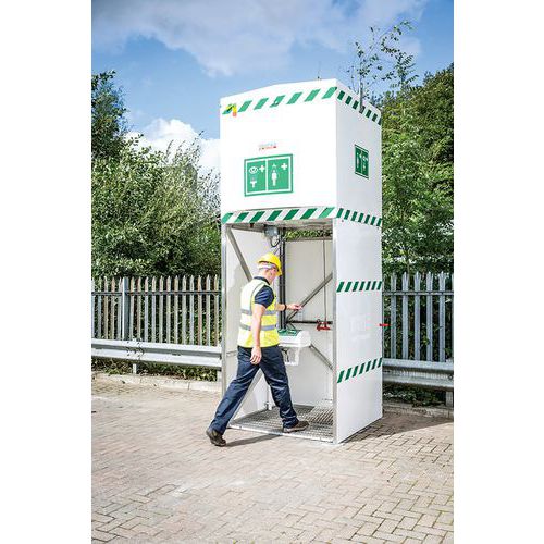Duche de segurança com reservatório de 350 L isolado, com lava-olhos/rosto. Adequado para utilização em ambientes perigosos e não perigosos. Fornece um caudal constante de água potável durante alguns minutos, mesmo sem alimentação da água da rede. O isolamento térmico mantém a temperatura constante da água do reservatório. Fácil ativação do duche através da barra antipânico.