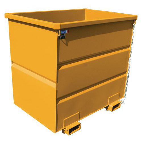 Contentor de esvaziamento integral por basculamento. Modelos com base empilhável e prática, com pega do porta-paletes entre as mangas. Interior de fundo plano para evitar obstruções. Caixa com aro superior reforçado por rebordo com 3 dobras anticorte. Chapa espessa dobrada 20/10. Fabricado na UE CE Carga máx. (kg) : 1500 kg