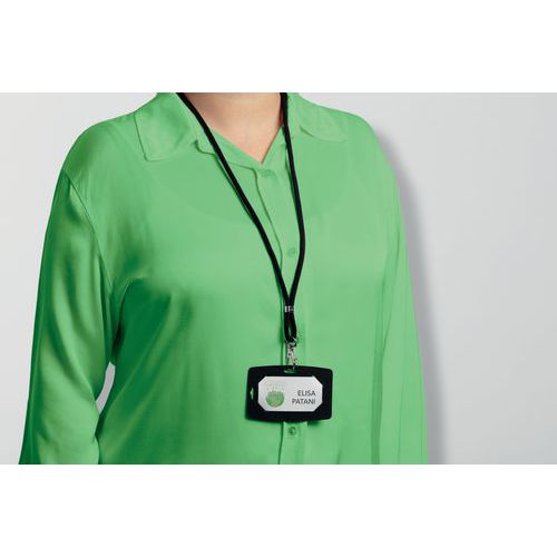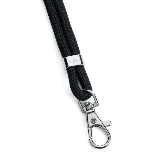 Com fecho de segurança que se abre se puxado com muita força. Cordão redondo com mosquetão. Ideal para crachás de identificação com recorte para clipe ou como porta-chaves. Comprimento do cordão: 46 cm. Feito com material durável.
