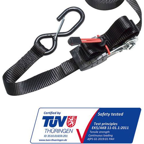 | Nome do artigo | Correia de catraca, Comp.: 4250 mm, CMU: 400 kg, Largura: 25 mm, Cores: Preto, Correia material: Poliéster |