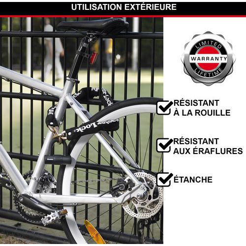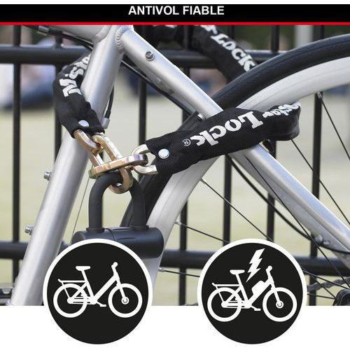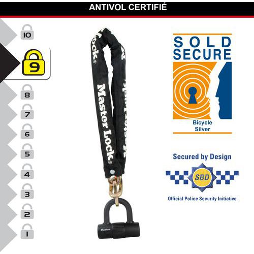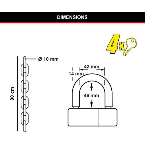 - Corrente em aço cementado e elos quadrados de 90 cm x Ø 10 mm - Mini-cadeiado em U com fecho duplo e asa Ø 14mm, fornecido com 4 chaves.