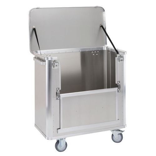 Carro-contentor em alumínio para utilização universal. Higiénico, não enferruja nem contém odores. Utilização fácil e ergonómica, mesmo com o nível de carga máximo. Superfície lisa e paredes sem nervuras que permitem uma limpeza fácil. Parede rebatível imobilizável em posição de abertura graças a dois ímanes. Tampa com dobradiças, 2 correias de fixação e 2 fechos com alavanca. Fundo inclinado com 2 orifícios de evacuação equipados com válvula de evacuação, tampa e corrente. Fundo impermeabilizado com silicone. Pegas anodizadas nas duas paredes dianteiras.