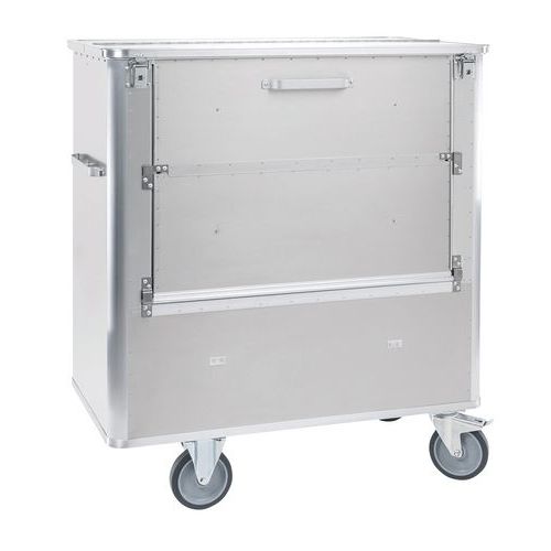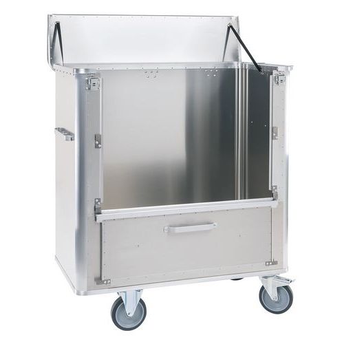 Carro-contentor em alumínio para utilização universal. Higiénico, não enferruja nem contém odores. Utilização fácil e ergonómica, mesmo com o nível de carga máximo. Superfície lisa e paredes sem nervuras que permitem uma limpeza fácil. Parede rebatível imobilizável em posição de abertura graças a dois ímanes. Tampa com dobradiças, 2 correias de fixação e 2 fechos com alavanca. Fundo inclinado com 2 orifícios de evacuação equipados com válvula de evacuação, tampa e corrente. Fundo impermeabilizado com silicone. Pegas anodizadas nas duas paredes dianteiras.