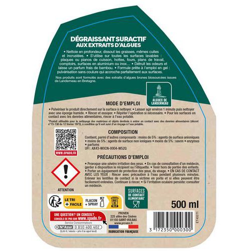 | Nome do artigo | Desengordurante à base de extratos de algas de 500 ml – Spado, Produto desinfetante: não |