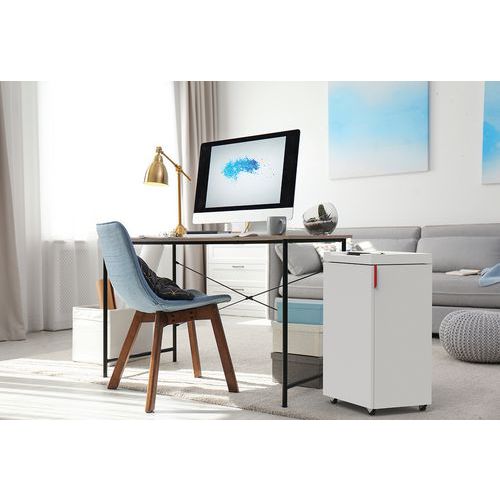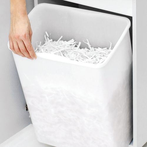 Destruidor de documentos com sistema de proteção e de segurança P-4. Smiley luminoso que indica a capacidade máxima do destruidor, evita encravamentos. Bloco de corte em aço especial, robusto e seguro, compatível com cartões bancários, CD e clipes. Início/paragem automático por célula. Móvel em madeira com porta, montado com rodízios. Recetáculo prático com pega de preensão. Ideal para teletrabalho
