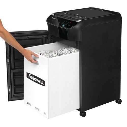 Destruidor ultrassilencioso com carregamento autónomo. Uma simples pressão no ecrã tátil inicia a destruição. Destrói até 550 folhas em total autonomia. Indicado para agrafos, clipes, papel amarrotado, cartões de crédito e CD. Com rodízios.