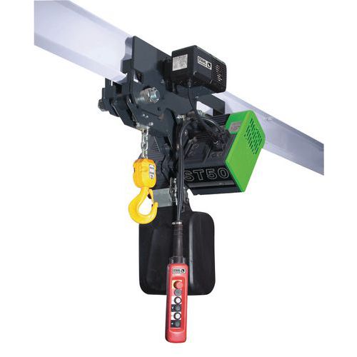 De série: aparelhagem de comando de muito baixa tensão (TBT 48 V), paragem de emergência, 3 m de altura de elevação com gancho, caixa de corrente, caixa de comando com 1,8 m de cabo.
