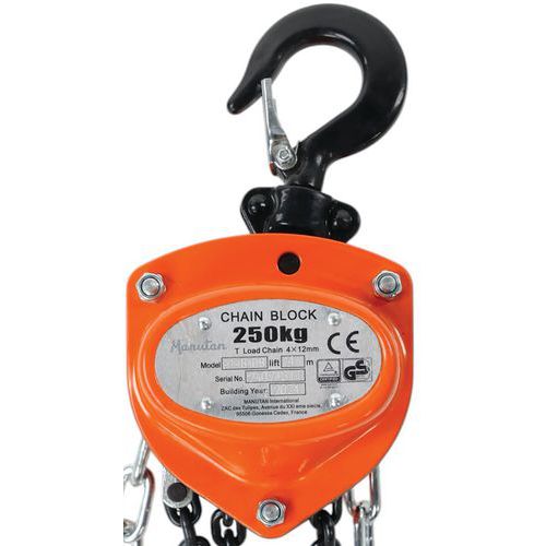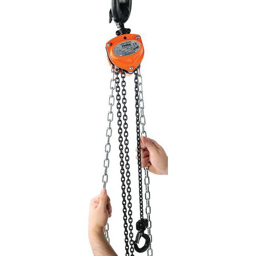 Diferencial de corrente compacto e robusto. Travagem excecional. Elevação fácil em total segurança. Ganchos giratórios em aço liga de aço estampada a preto e equipados com linguetas de segurança forjadas. Correntes de carga de grau 80 e galvanizadas. Garantia do cliente : 10 anos Capacidade (kg) : 250 kg