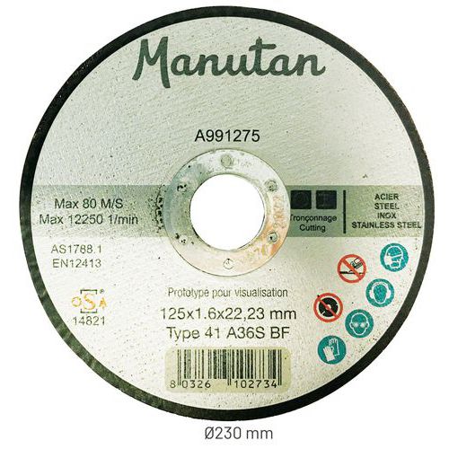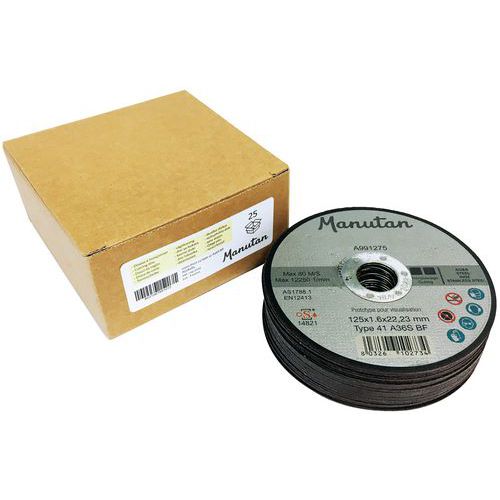 Disco de corte plano para aço e inox. Indicado para máquinas elétricas portáteis. Fabricado com elementos abrasivos e juntas indicadas para obter cortes rápidos e eficazes. Disco de corte em conformidade com a norma EN 12413.