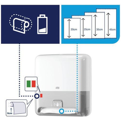 | Nome do artigo | Distribuidor de toalhetes para limpeza de mãos elétrico Tork Matic Sensor, Cores: Branco, Altura: 400 mm |