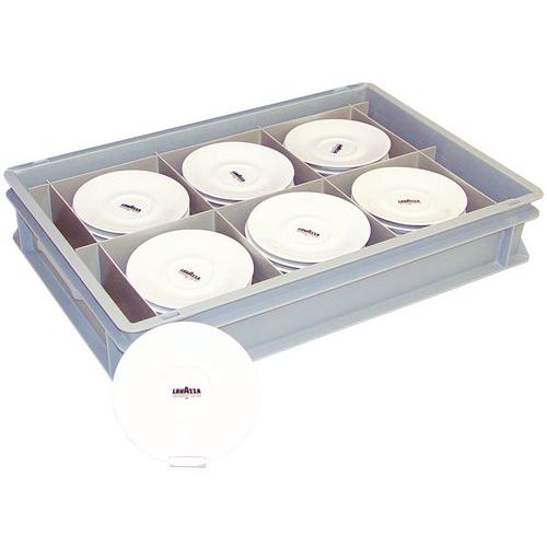 Divisórias para pratos a inserir em caixas empilháveis das normas europeias RAKO 3-200Z-0 ou 3-208Z-0, dependendo das referências. Dependendo dos tamanhos dos pratos, as caixas têm capacidade para 80 pratos.