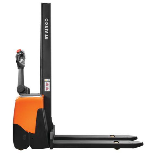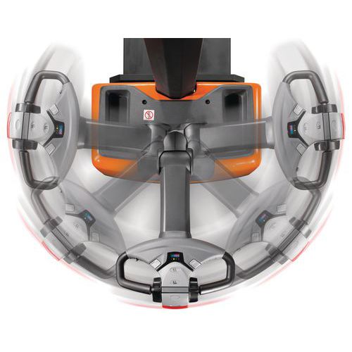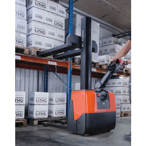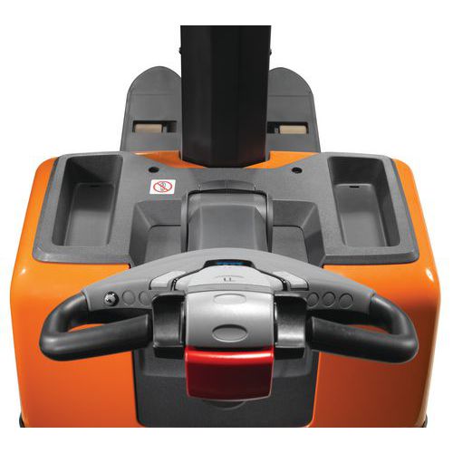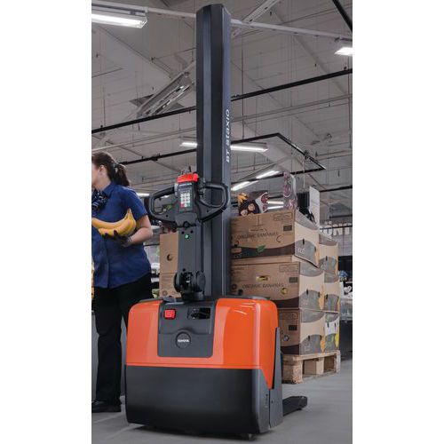 Empilhador elétrico ergonómico e fácil de manobrar em espaços exíguos.