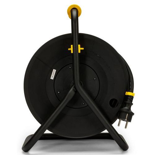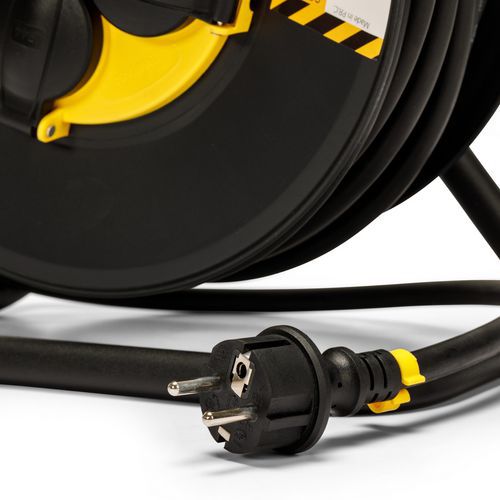 Enrolador profissional com pega ergonómica e prática para utilização com luvas de trabalho. Quadro em aço extremamente resistente. À prova de água IP44, ideal para jardim, bricolagem, estaleiros de construção civil ou trabalhos profissionais. Cabo de 25 m ou 40 m H07RN-F em neopreno 3G 2,5 m㎡. Com disjuntor térmico, botão rotativo de enrolamento. Potência máx. enrolado: 1100 W, desenrolado: 3200 W.