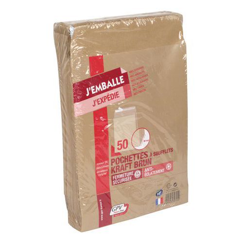 Envelope em cartão kraft castanho com foles para a expedição de livros ou documentos espessos. Papel kraft resistente a rasgos e perfurações. Fácil e rápido de fechar graças ao fecho autocolante com faixa de proteção.