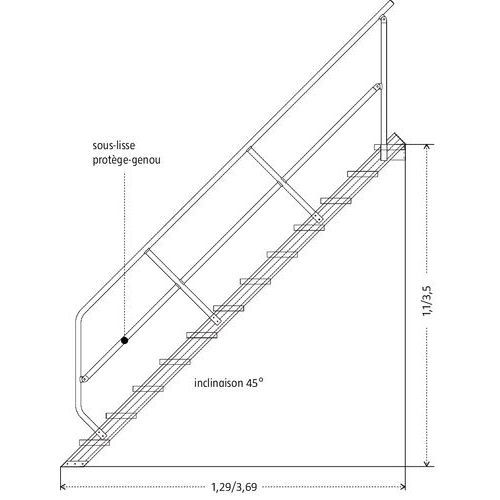 Escada pré-perfurada, pronta a fixar. Degraus muito resistentes à torção. Equipada com 1 corrimão que pode ser montado do lado esquerdo ou direito, conforme preferir. Escada para fixar com cantoneiras na parte superior e com esquadrias no solo. Produto fabricado em França. Fabricado na UE Carga máx. (kg) : 150 Garantia do cliente : 5 anos