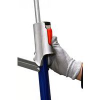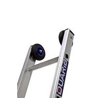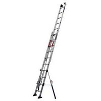 Escada extensível de 2 secções com corda e estabilizadores rebatíveis com regulação milimétrica. Calço amplos articulados com base antiderrapante. Suporte plano para os pés para uma posição estável e confortável. Manuseamento fluido e sem gripagem graças às calhas equipadas com guias em poliamida. Descida controlada da secção extensível: sistema antiqueda em aço com braço duplo, suporta 350 kg. Acessório de fixação de escadas e afastador de parede. Fabricado em França. Perfis amplos em alumínio fechados. Suporte da polia em alumínio fundido (55 mm de Ø). Rodas de parede com 125 mm de Ø com piso que não deixa marcas. Montado por engaste.
