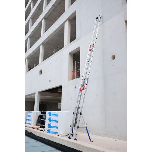 Escada extensível de 3 secções com corda e estabilizadores rebatíveis com regulação milimétrica. Calço amplos articulados com base antiderrapante. Suporte plano para os pés para uma posição estável e confortável. Manuseamento fluido e sem gripagem graças às calhas equipadas com guias em poliamida. Descida controlada da secção extensível: sistema antiqueda em aço com braço duplo, suporta 350 kg. Estabilizadores com regulação milimétrica para se adaptar a todos os tipos de ambientes de trabalho. Pés sempre na horizontal graças à orientação cuidadosamente concebida das barras. Patins amplos e articulados com uma sola com relevo antiderrapante.