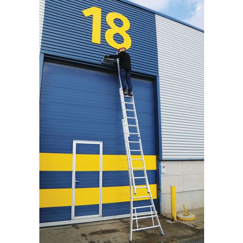 Escada deslizante, separável e transformável em escada dupla. Ganchos nos degraus para bloqueio dos 2 elementos após extensão. Estabilidade lateral ideal garantida pela base muito alargada. Escada de dois planos com revestimento de poliéster que não mancha as mãos.