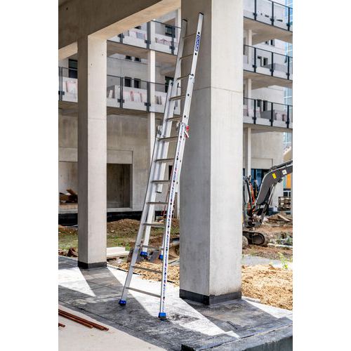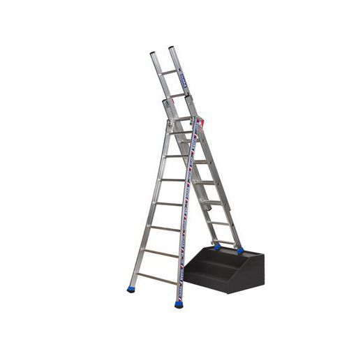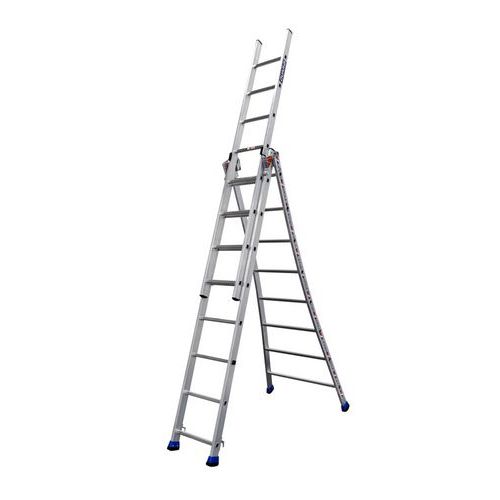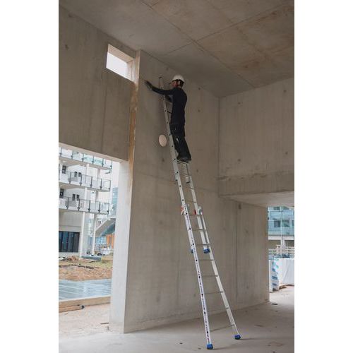 Escada transformável de 3 secções com base alargada para maior estabilidade em pisos irregulares. Articulação aparafusada ao perfil. Abertura fácil da escada graças a um eixo de orientação integrado. Calços em polipropileno para um deslizamento suave e sem esforço das secções. Calços antiderrapantes grandes.