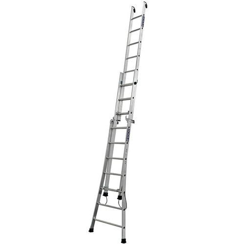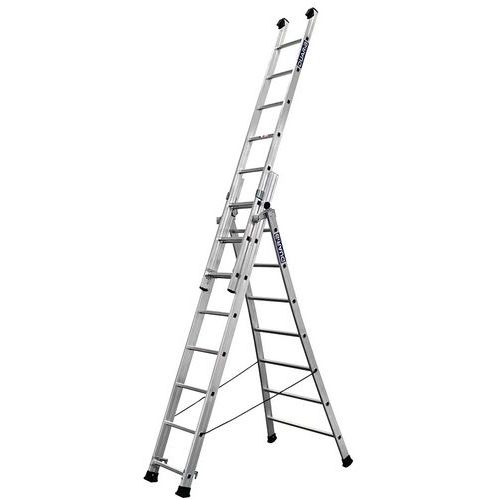 Escada transformável de 3 secções com base alargada para compensar as irregularidades do piso e contornar obstáculos. Articulações em alumínio fundido. Abertura fácil da escada graças a um eixo de orientação integrado. Calços de parede para proteger as superfícies na posição de apoio. Ganchos em aço com fecho para apoio das secções. Cordas para fixação antiafastamento para maior estabilidade. Calços antiderrapantes e antideslizamento. Mudança de posição fácil e sem ferramentas. Acessório de fixação de escadas e afastador de parede. Fabricado em França. Perfis amplos em alumínio fechados. Garantia do cliente : 5 anos Carga máx. (kg) : 150