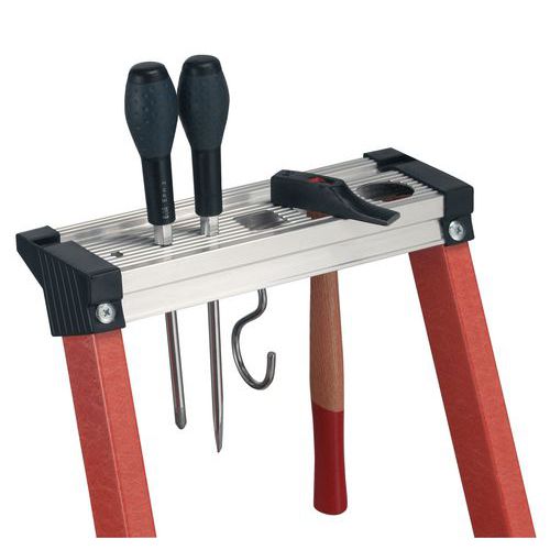 - Porta-ferramentas com gancho e compartimento para elementos de fixação.