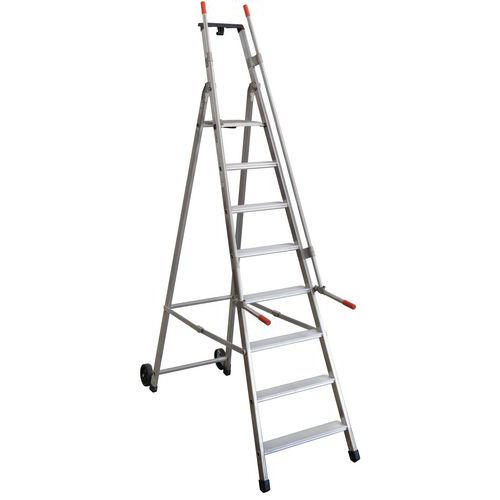 Escadote profissional equipado com 2 rampas de segurança. Pegas dobráveis para a elevação do plano de montagem. Mola em alumínio antifecho e antiafastamento. Rodas basculantes ativadas apenas após a elevação do plano de montagem. Fabricado na UE Garantia do cliente : 3 anos Carga máx. (kg) : 150 kg