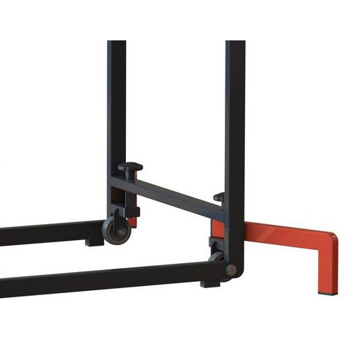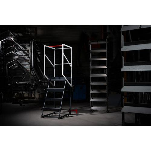 Escadote com rodas e degraus autossustentáveis e antiderrapantes. Fiabilidade e elevada segurança: estrutura totalmente mecanossoldada. Balaustrada de segurança, batente antideslizamento e barra antiqueda. Plataforma em chapa de alumínio de gotas antiderrapante. Escadote com rodas leve, compacto e manobrável com rodízios dianteiros que não deixam marcas. Altura da balaustrada de segurança: 1 m.