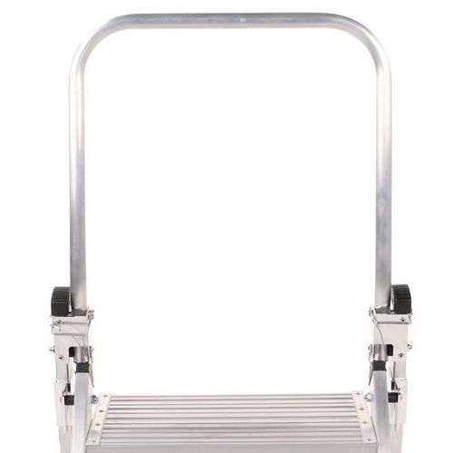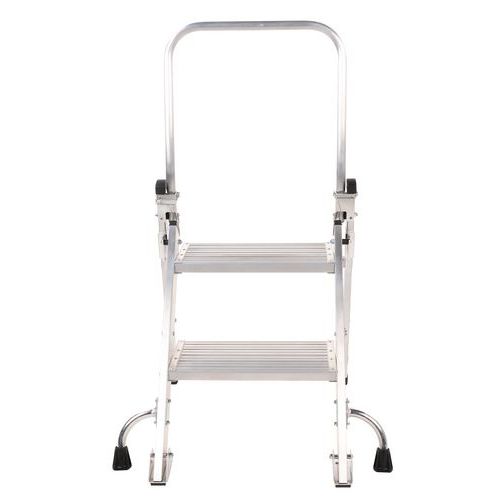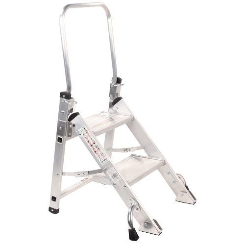 Miniescadote leve e resistente com degraus largos. Acesso seguro com balaustrada de segurança na parte superior. Elevada estabilidade: pés duplos no chão na face dianteira. Fácil de arrumar, com dobragem da estrutura extremamente rápida. Capacidade antiderrapante garantida, com pés em alumínio revestidos a borracha. Carga máx. (kg) : 150 Garantia do cliente : 10 anos