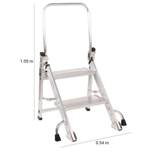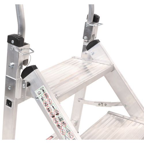 Miniescadote leve e resistente com degraus largos. Acesso seguro com balaustrada de segurança na parte superior. Elevada estabilidade: pés duplos no chão na face dianteira. Fácil de arrumar, com dobragem da estrutura extremamente rápida. Capacidade antiderrapante garantida, com pés em alumínio revestidos a borracha.