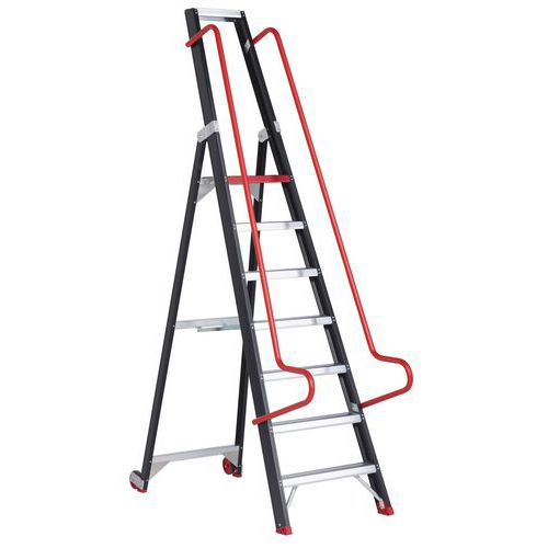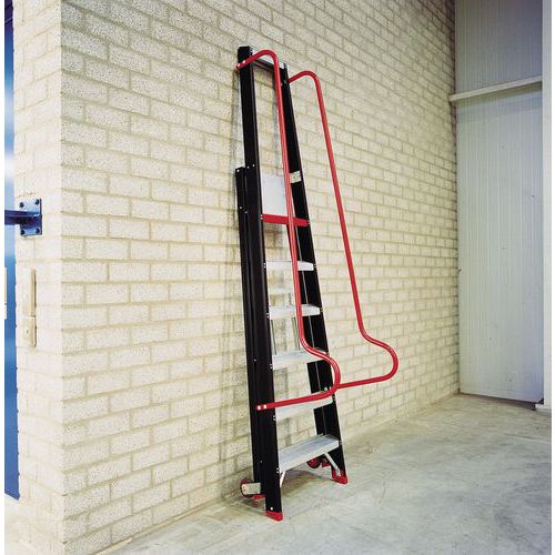 - Escadote de armazém fácil de deslocar com os seus rodízios fixos traseiros.