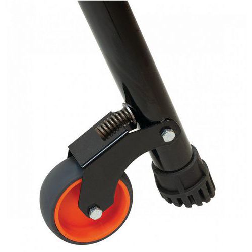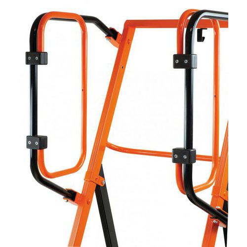 Rodas com mola. Tubo traseiro elevado. Ocupa pouco espaço. Balaustrada de segurança rebatível. Robusta e fácil de deslocar. Dimensões do suporte para ferramentas: Comprimento 450 mm, Largura 80 mm, Altura 25 mm.