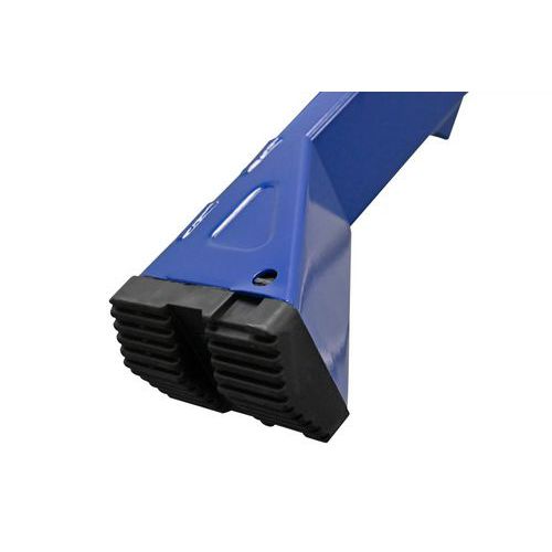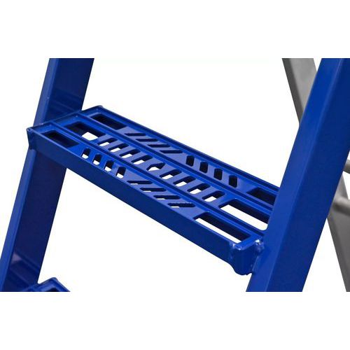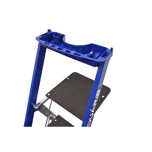 Escadote em alumínio lacado com prateleira rebatível para tinta para bidão de 15 L (25 kg no máx.). Prateleira de grande capacidade para ferramentas com dois ganchos integrados. Degraus fixados aos montantes através de soldadura manual para uma fixação superior. Degraus com plataforma gradeada antiderrapantes com 100 mm de largura, confortáveis e fáceis de limpar. Instalação fácil e arrumação rápida.