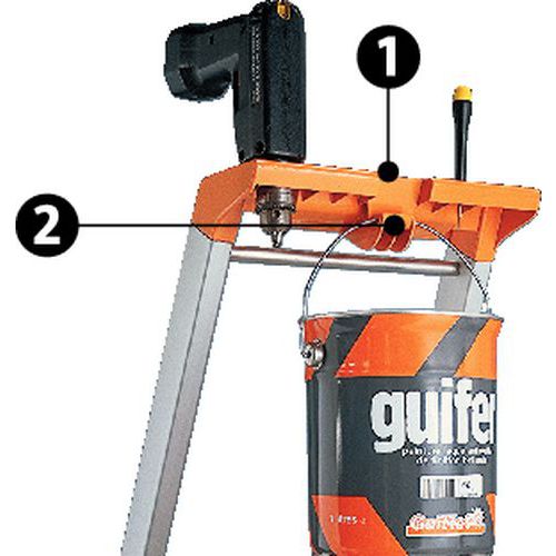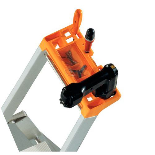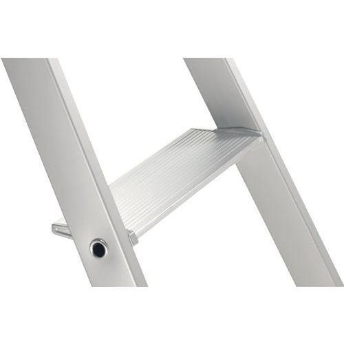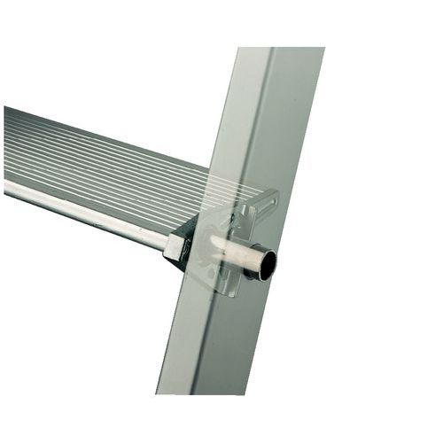 Montantes anodizados para um trabalho mantendo as mãos limpas. Apoio para os pés antiderrapante reforçado de 280 x 250 mm. Ligação entre os montantes e os degraus através de peça técnica com extremidade antirrotação. Articulações em alumínio montadas em peça de poliamida (sem risco de gripagem). Plano de apoio alargado para melhor estabilidade. Degraus com 90 mm de largura. Calços de retenção de alta segurança. Balaustrada de segurança antibasculamento dianteira: altura: 656 mm. Produto fabricado em França.
