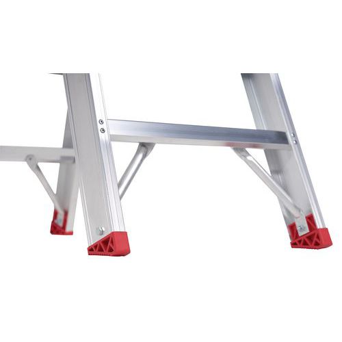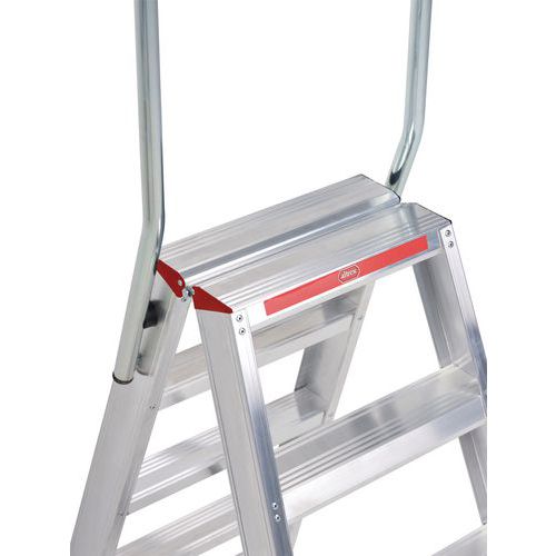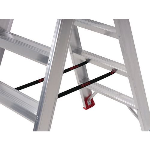 Escadote profissional de acesso duplo em alumínio extremamente leve, com degraus com perfil oco. Os degraus são fixados através de rebites tubulares. Desta forma, podem ser substituídos rapidamente, em caso de necessidade. Segurança garantida graças ao sistema de dobradiça, que impede que entale os dedos, e o perfil antiderrapante.