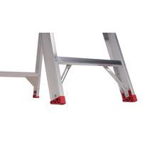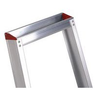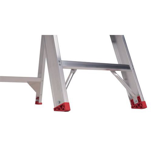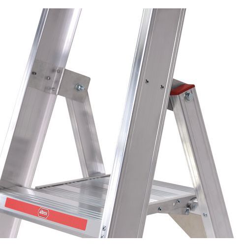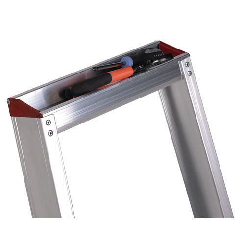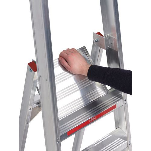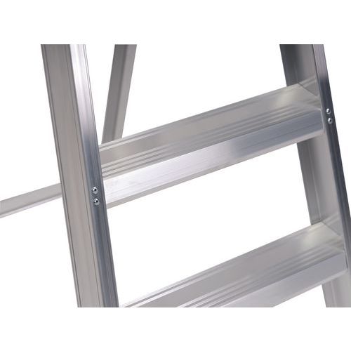 Escadote profissional de acesso simples em alumínio extremamente leve, com degraus de perfil oco. Os degraus são fixados através de rebites tubulares. Desta forma, podem ser substituídos rapidamente, em caso de necessidade. Dobre e abra o escadote de forma rápida e fácil, graças ao sistema de dobradiça com autobloqueio da plataforma.