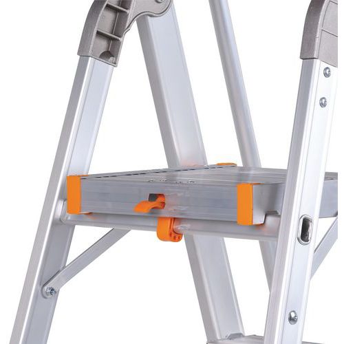 Escadote profissional em alumínio. Prateleira porta-ferramentas multifunções. Confortável e seguro com rampa. Perfis reforçados em alumínio. Sistema de bloqueio da plataforma. Degraus antiderrapantes. Fácil de transportar e arrumar.