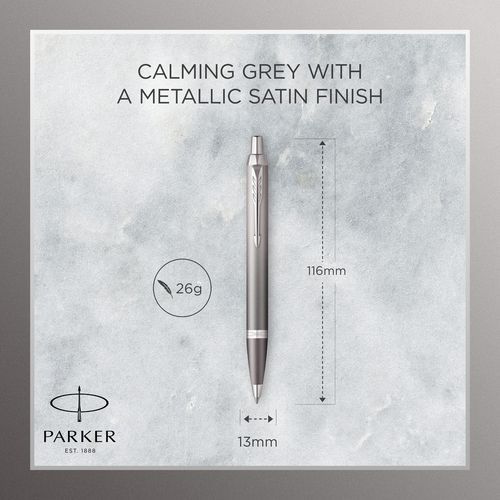 Esferográfica IM Writing Rituals cinzenta com gradação, acabamento cromado, ponta média e tinta azul.
