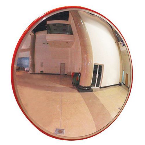 Espelho de segurança com moldura em laranja para sinalizar espaços perigosos. Controlo em 3 direções graças à visão de 130°. Excelente qualidade de imagem.