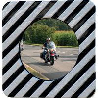 Espelho rodoviário para melhorar a segurança e reduzir os perigos em áreas potencialmente perigosas. Muito resistente: testado em ventos fortes, de força 12 (furacão superior a 117 km/h). Suporte de fixação em poste ou mural de quatro pontos com junta esférica, mais resistente do que um suporte convencional. Moldura preta/branca para atrair a atenção do condutor. Versão em inox: resistente a temperaturas elevadas