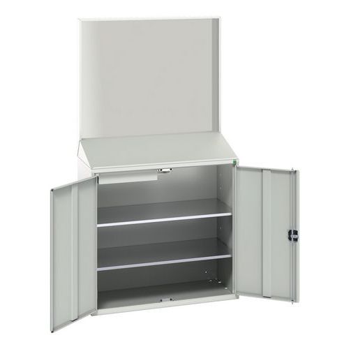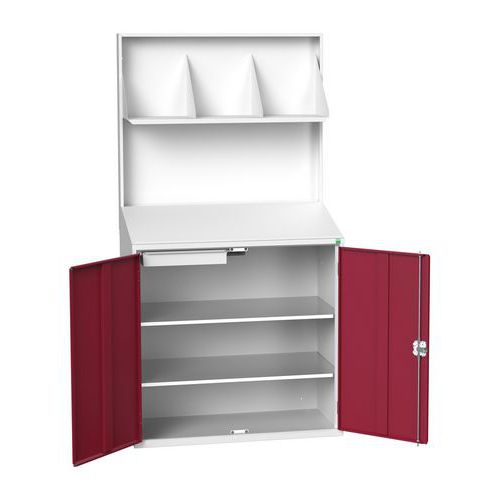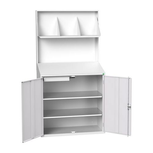 Posto de consulta equipado com painel traseiro e prateleira alta. Superfície de escrita inclinada. Bloco baixo equipado com 2 prateleiras em aço galvanizado e 1 gaveta. Portas duplas reforçadas e pegas integradas. Sistema de fecho através de fechadura. Fabricado no UK