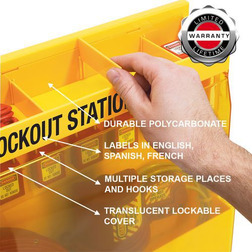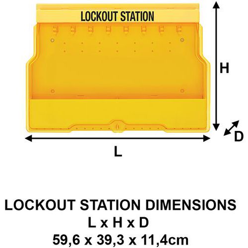 Estação de segurança compacta para armazenamento e localização fácil de cadeados e acessórios de segurança para máquinas perto de um ponto de segurança.