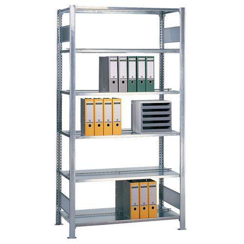 Estante de escritório com acabamento elegante, para cargas leves. As prateleiras integralmente em chapa suportam qualquer tipo de artigo. Batente central para delimitar cada face. Montante integral em chapa sem perfuração na face dianteira. Os pés de proteção preservam o piso. Montagem sem ferramentas graças ao sistema de clipe.