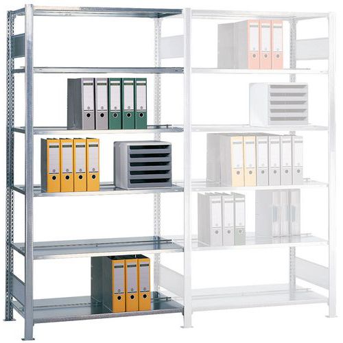 Estante de escritório com acabamento elegante, para cargas leves. As prateleiras integralmente em chapa suportam qualquer tipo de artigo. Montante integral em chapa sem perfuração na face dianteira. Barra de batente para evitar a queda de objetos. Os pés de proteção preservam o piso. Montagem sem ferramentas graças ao sistema de clipe.