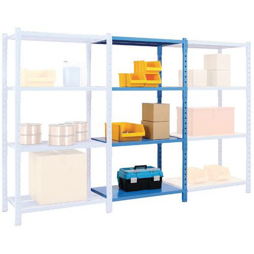 Estante muito estável com elevada capacidade de carga, até 2,5 t. Fácil extensão acrescentando um ou mais elementos adicionais. Com prateleira fechada para impedir a queda de objetos. Estante pesada, fácil de montar e de expandir.