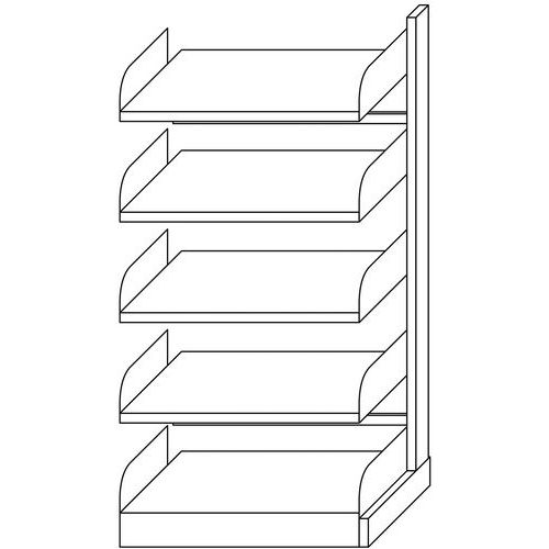 Composição: Face simples: 1 ou 2 ilhargas abertas (elemento inicial 2, elemento adicional 1) - 5, 6 ou 7 prateleiras integrais em chapa (consoante a altura) Face dupla: 2 ou 4 ilhargas abertas (elemento inicial 4, elemento adicional 2) - 5, 6 ou 7 prateleiras integrais em chapa (consoante a altura)