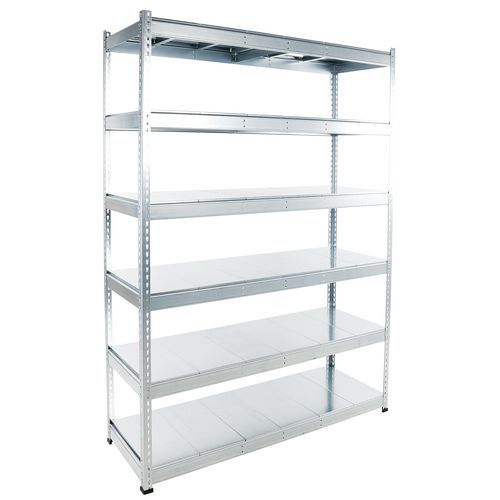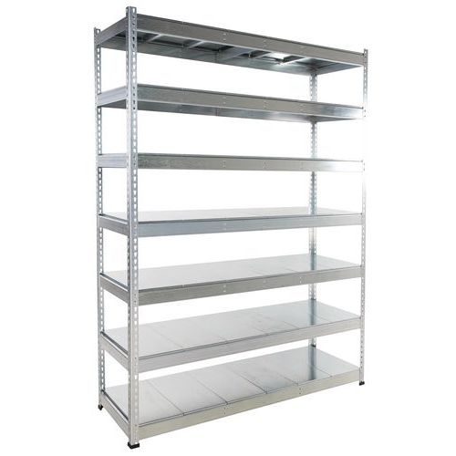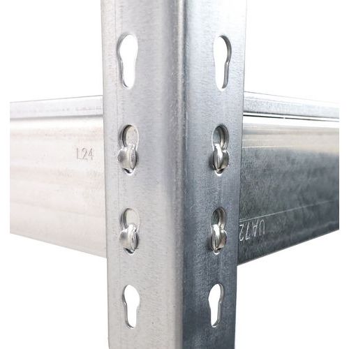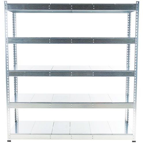 Estante industrial simples e ultrarrobusta, ideal para o armazenamento de mercadorias de cargas pesadas. Prateleira integral em aço, perfeita para o armazenamento de peças a granel e/ou produtos gordurosos. Acabamento zincado para zonas húmidas ou tinta epóxi em azul/cinzento para ambientes secos. Prateleira de armazém de montagem fácil, sem necessidade de recorrer a técnicos ou ferramentas específicas.