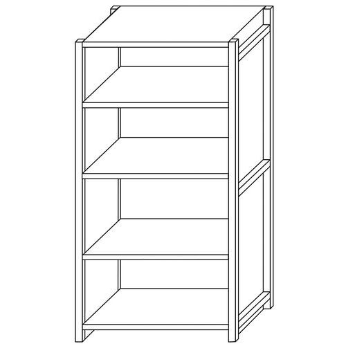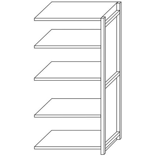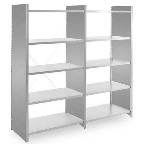 Estante de escritório leve e robusta. Acabamento galvanizado. Estrutura fechada nas laterais com ilhargas integrais. Inoxidável, adequada para ambientes húmidos. Extensível com a adição de 1 ou mais elementos adicionais. Acabamento galvanizado, ideal para artigos húmidos e espaços exteriores.